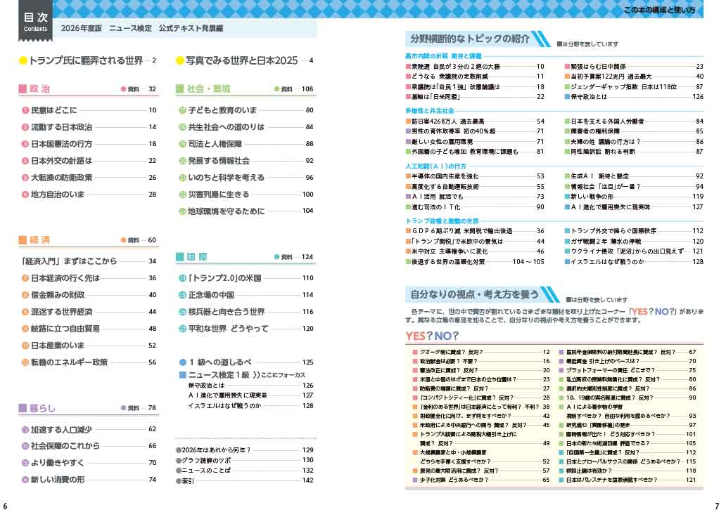 2026年度に実施される2~5級の検定問題は2026年度版公式テキスト・問題集をもとに出題されます(各教材の「練習問題」からの出題は、関連・類似問題を含みます)。これら公式教材は原則として2025年末までのニュースに基づいて編集していますが、一部のテーマはそれ以降の動きを踏まえた内容も含んでいます。1級の記述式問題の一部は公式問題集から出題されます。