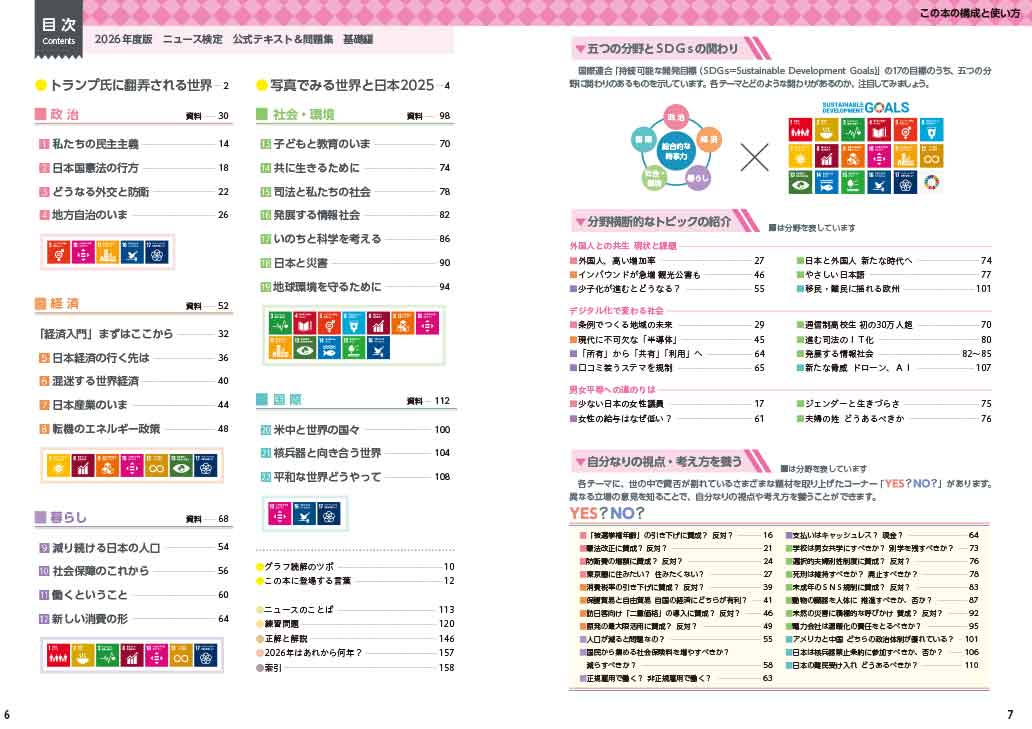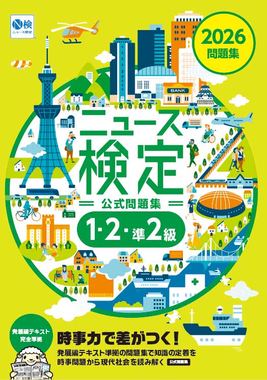 2026年度に実施される2~5級の検定問題は2026年度版公式テキスト・問題集をもとに出題されます(各教材の「練習問題」からの出題は、関連・類似問題を含みます)。これら公式教材は原則として2025年末までのニュースに基づいて編集していますが、一部のテーマはそれ以降の動きを踏まえた内容も含んでいます。1級の記述式問題の一部は公式問題集から出題されます。